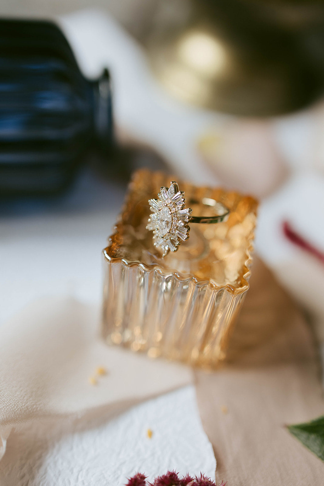 A captivating blend of timeless elegance and modern sophistication, Aurora features approximately a 0.5 carat Marquise center stone surrounded by a diamond halo. Crafted with precision, the 20.33mm ring boasts top and bottom kite cut stones, tapered baguettes, and delicate round melee stones.